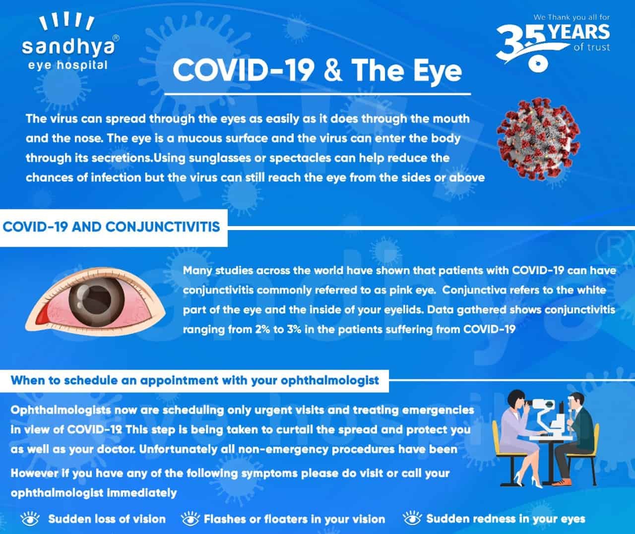 Ophthalmologists now are scheduling only urgent visits and treating emergencies because of COVID-19. This step is being taken to curtail the spread and protect you as well as your doctor. Unfortunately, all non-emergency procedures have been postponed. However, if you have any of the following symptoms please do visit your ophthalmologist immediately: